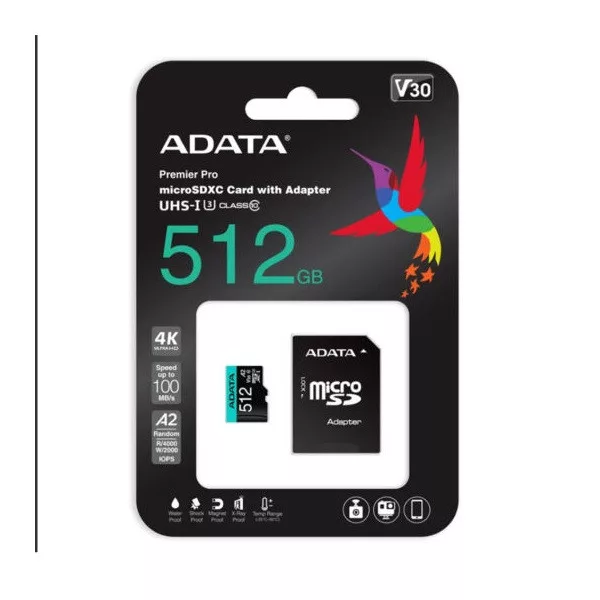 ADATA MicroSD kártya - 512GB microSDXC UHS-I U3 Class10 A2 V30S (R/W: 100/85 MB/s) + adapter