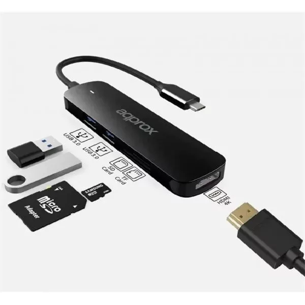 APPROX USB HUB - Type-C 5in1 HUB (2db USB3.0, 1db MicroSD 1db SD kártya, 1db HDMI 4k30Hz) Fekete