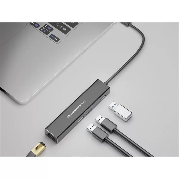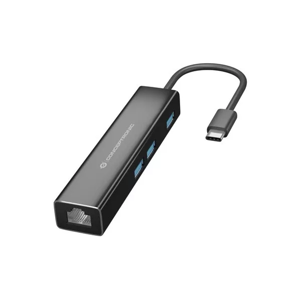 Conceptronic USB Hub - DONN07B (USB-C to 3xUSB-A 3.0+RJ-45, fekete)