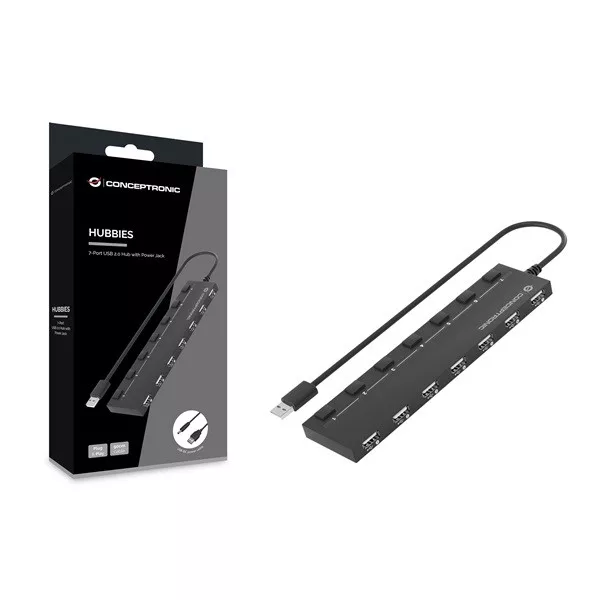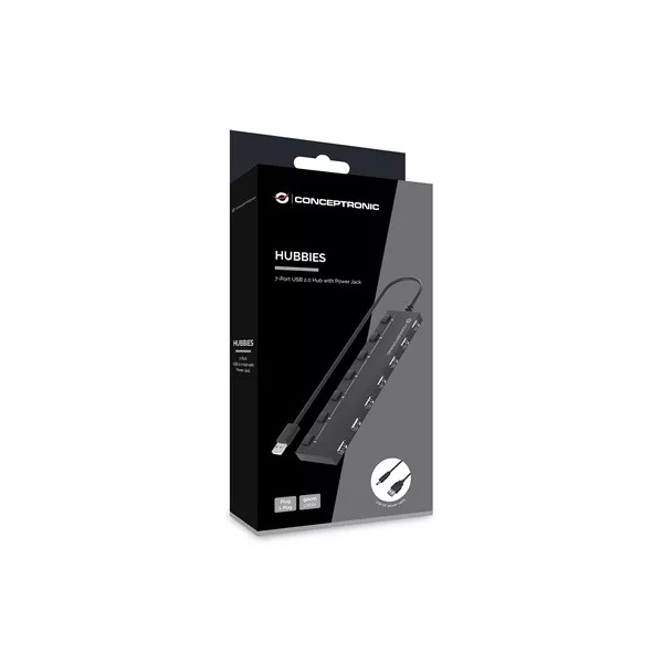 Conceptronic USB Hub - HUBBIES08B (7 Port, USB-A to 7xUSB 2.0, USB táp, fekete)