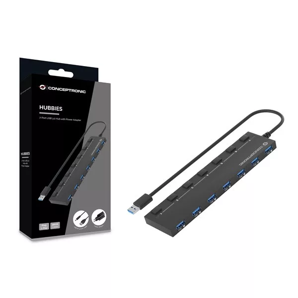 HUBBIES19BP 7-Port USB 3.0 Hub with 5.0V/3.0A Power Adapter, 90cm Cable, Individual Power Switch, USB 3.2 Gen 1