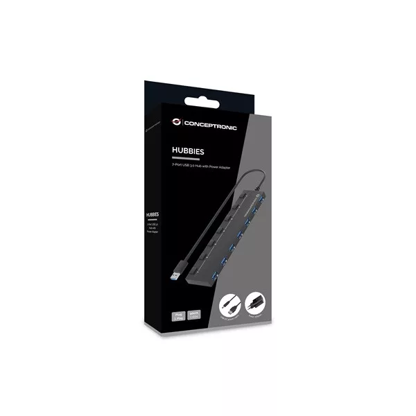 Conceptronic USB Hub - HUBBIES19BP (7 Port, USB-A to 7xUSB 2.0, külső táp, fekete)