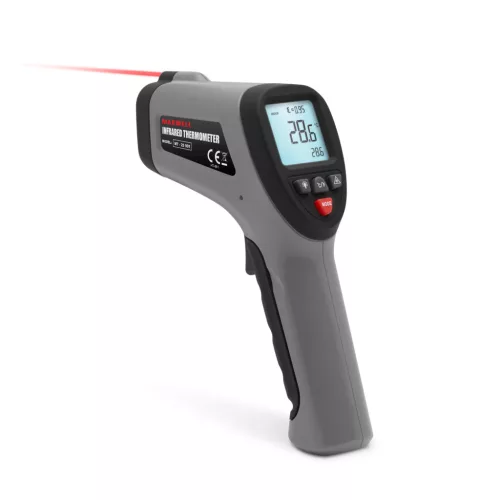 Infravörös hőmérsékletmérő műszer lézer irányzékkal és K típusú mérőszondával kiegészítve. Professzionális hőmérsékletmérési feladatokhoz ajánlott, ha nehezen megközelíthető a mérendő felület. Minimum, maximum, átlag eredmények kijelzése és széles intervallumban állítható emisszivitási érték jellemzi. Használatával elkerülhetőek az égési sérülések mérés közben. Könnyű és ergonomikus kialakítású készülékház.
