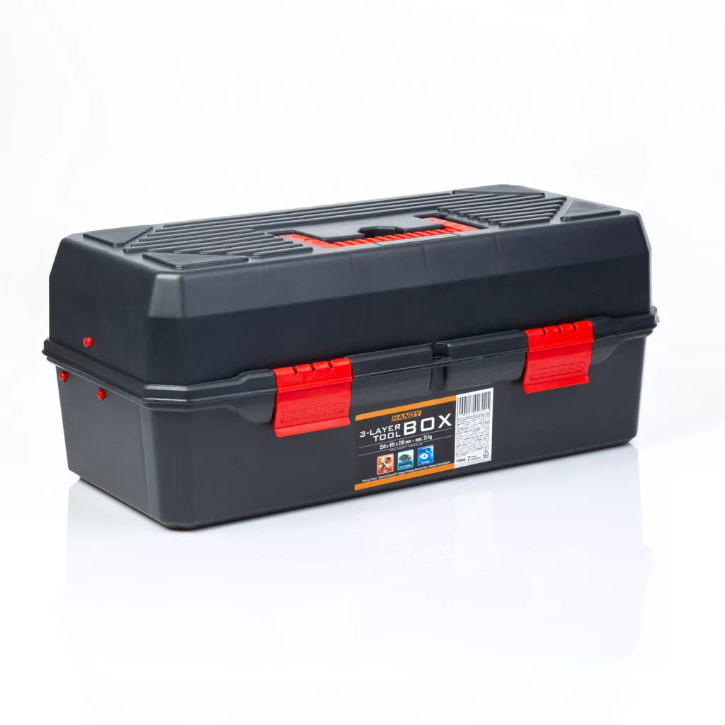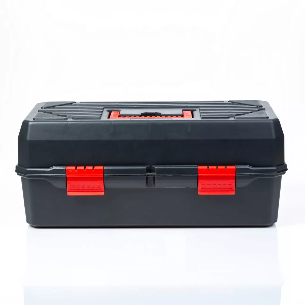 Klasszikus elrendezésű, harmónikaszerűen nyitható szerszámosláda. Erős műanyagból készült, így ellenáll az intenzív használatnak is. A szerszámokhoz történő könnyű hozzáférést a szélesre nyitható felső rész biztosítja. A különböző eszközök rendezetten tárolhatóak, áttekinthetőek és egyszerűen hozzáférhetőek a 2 szintes elrendezésnek köszönhetően.