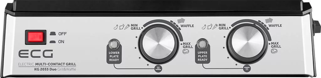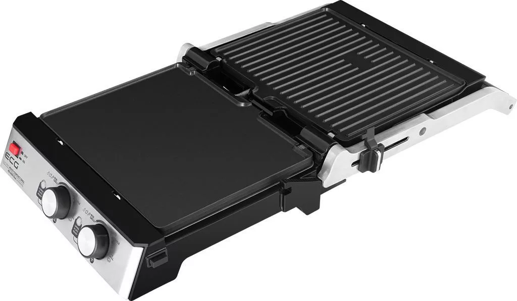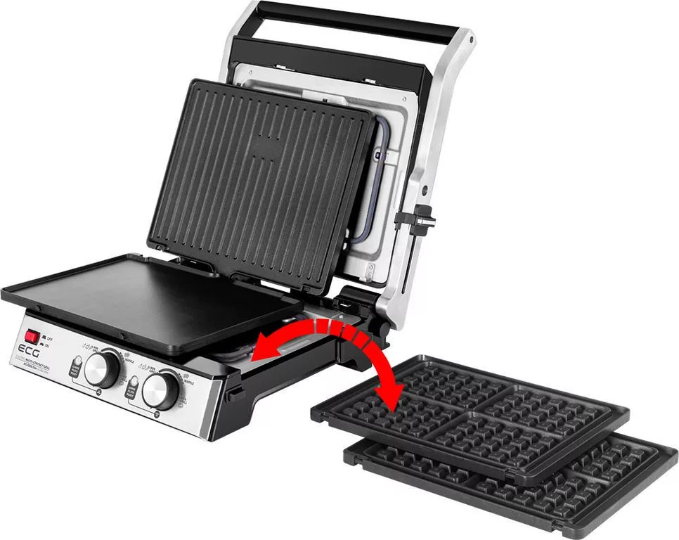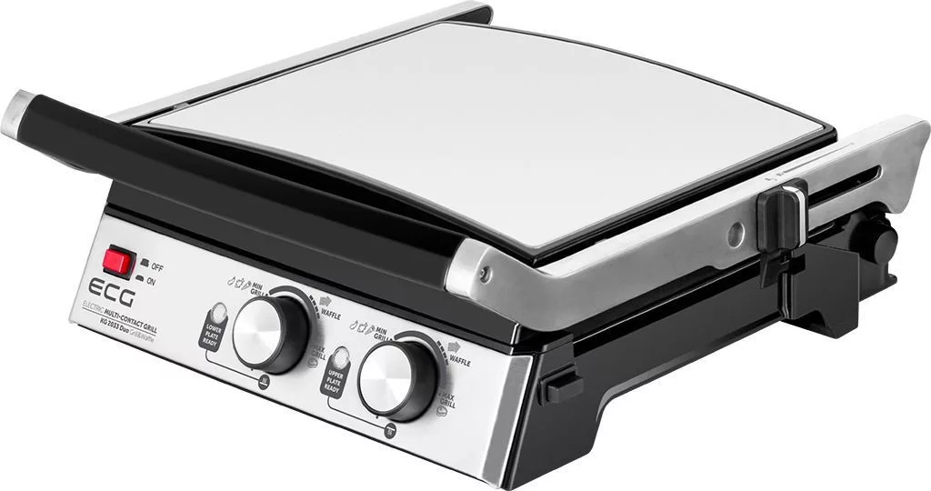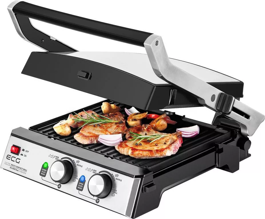 Sokoldalú 2 az 1-ben kontaktgrill és gofrisütő, 4 beállítható pozícióval: kontakt, kontakt nélküli, zárt és nyitott BBQ sütés. Dupla termosztát az alsó és felső lap külön vezérléséhez (140–230°C). Bordás és sima, valamint 4 adagos gofrilap tartozék. Tapadásmentes, kivehető lapok, úszó mechanika, hőszigetelt fogantyú, zsírfelfogó tálca és erős 2000W teljesítmény.