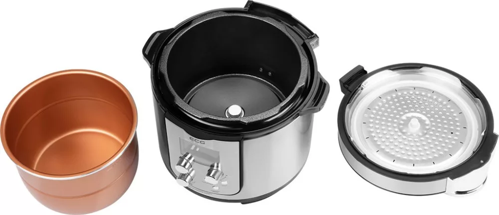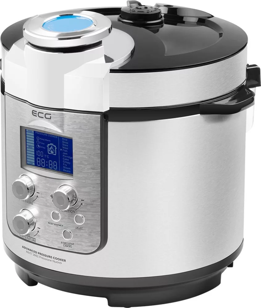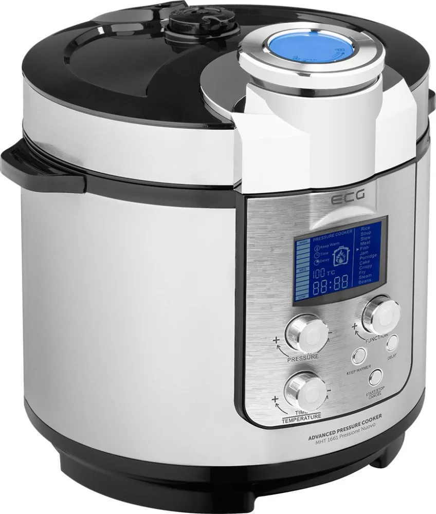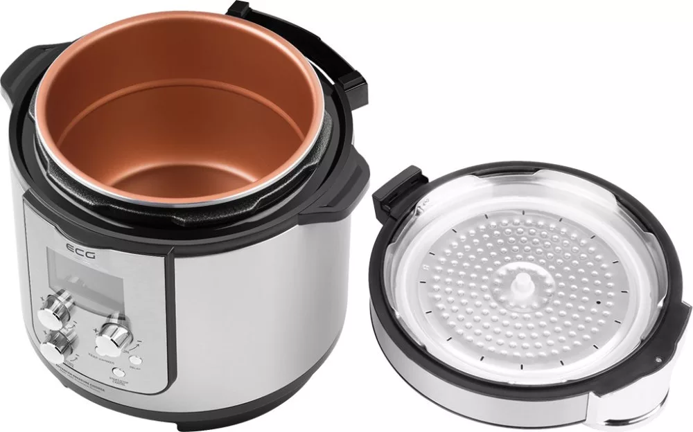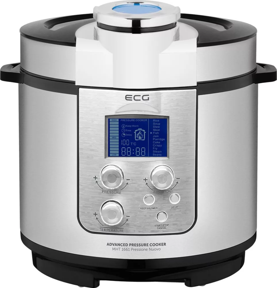 Multifunkcionális elektromos edény 6 liter teljes térfogattal. Az ECG MHT 1661 12 előre beállított programot, nyomásfunkciót kínál a szabályozás és a kézi beállítás lehetőségével. Az edény praktikus biztonsági felülete szigetelt falakkal rendelkezik, amelyek nem haladják meg az 50 °C-os hőmérsékletet.