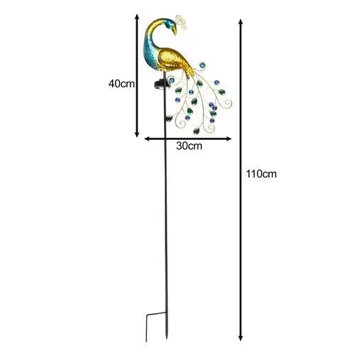 Dekoratív pávás LED-es napelemes kerti lámpa 40 színes fényponttal. Automatikus be- és kikapcsolás szürkületérzékelővel, IP44 vízállóság, 8-10 óra működési idő. Forgatható napelem a hatékony töltésért. Fém szerkezet, időjárásálló kialakítás. Ideális teraszra, kertbe vagy erkélyre.