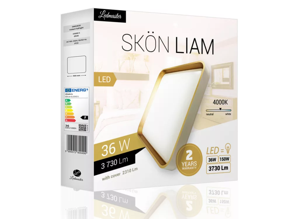 Skön Liam 36 W-os ø500 mm négyzet alakú natúr fehér fehér-arany színű mennyezeti lámpa IP20-as védettségű